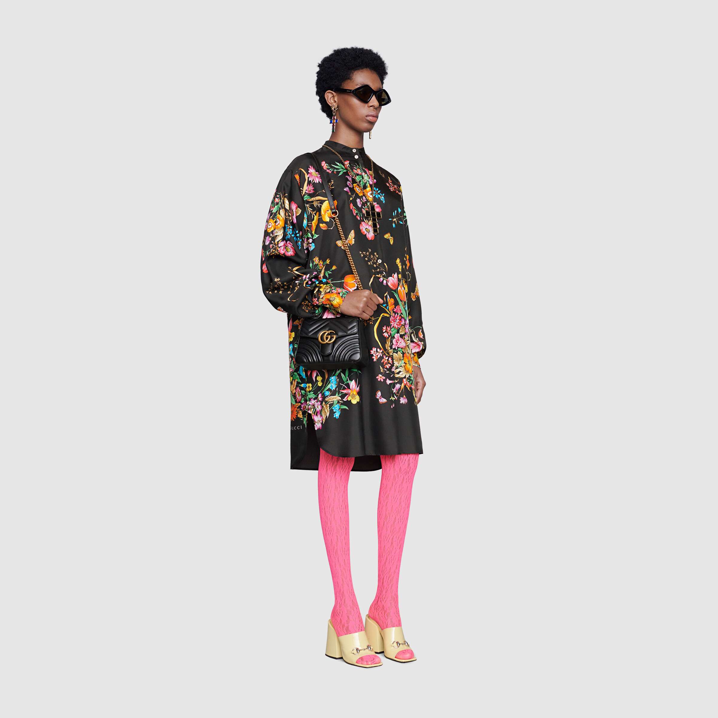 このGGマーモントライトピンクミニハンドバッグの全体的な形状は、柔らかくまっすぐに見え、特大のフラップとダブルGアクセサリーが付いています。レザーハンドルとチェーンショルダーストラップのデザインは互いに補完し合うため、快適な装着感が得られるだけでなく、さまざまなスタイリングオプションが可能になります。バッグ本体はハート型のV字型キルティングレザーをバックに使用し、マカロンのようなカラフルな色合いが2020年初秋のシリーズを華やかに彩ります。